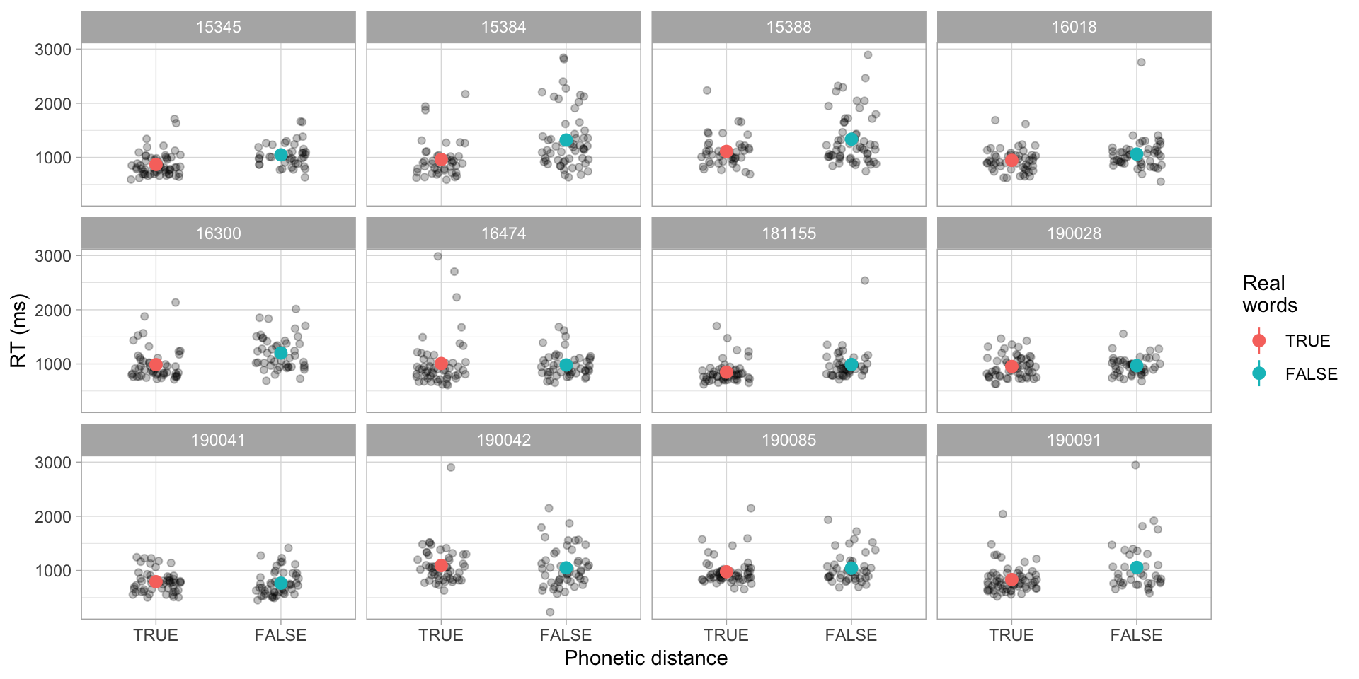 Figure 3: Jitter plot showing RTs by lexical status for a selection of participants.