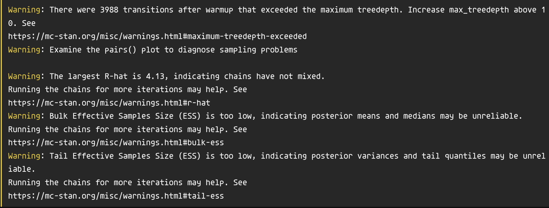 brm() warns you about divergent transition, \(\hat{R} > 1\) and low ESS and how to fix them.