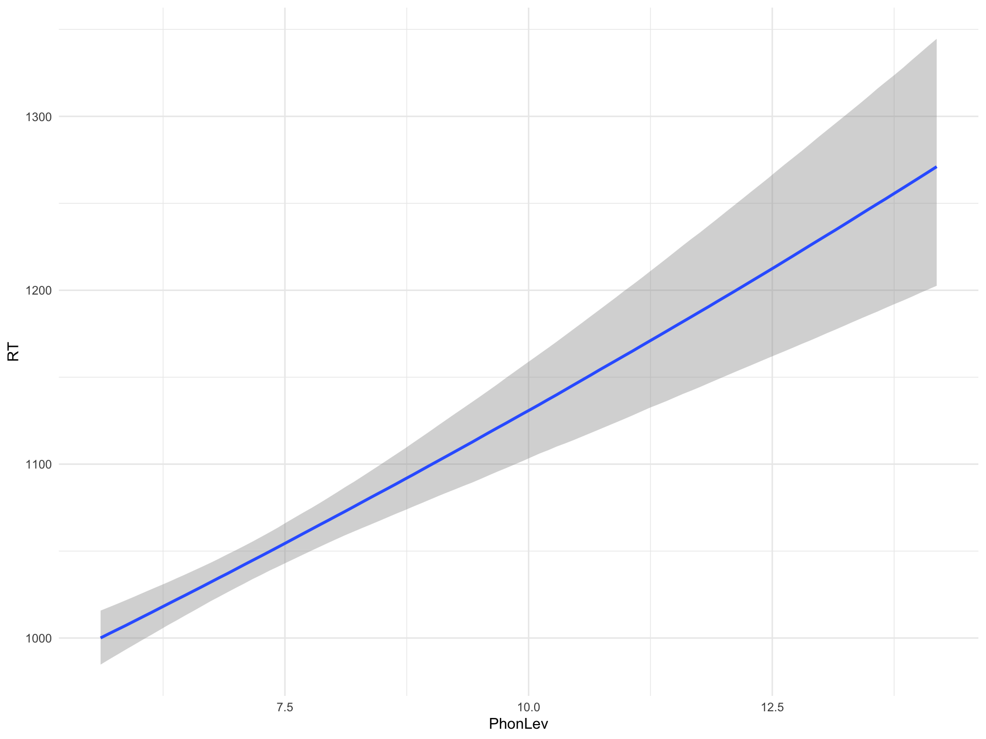 PhonLevFigure 1: Predicted effect of mean phone-level distance on RTs from a Bayesian regression model.
