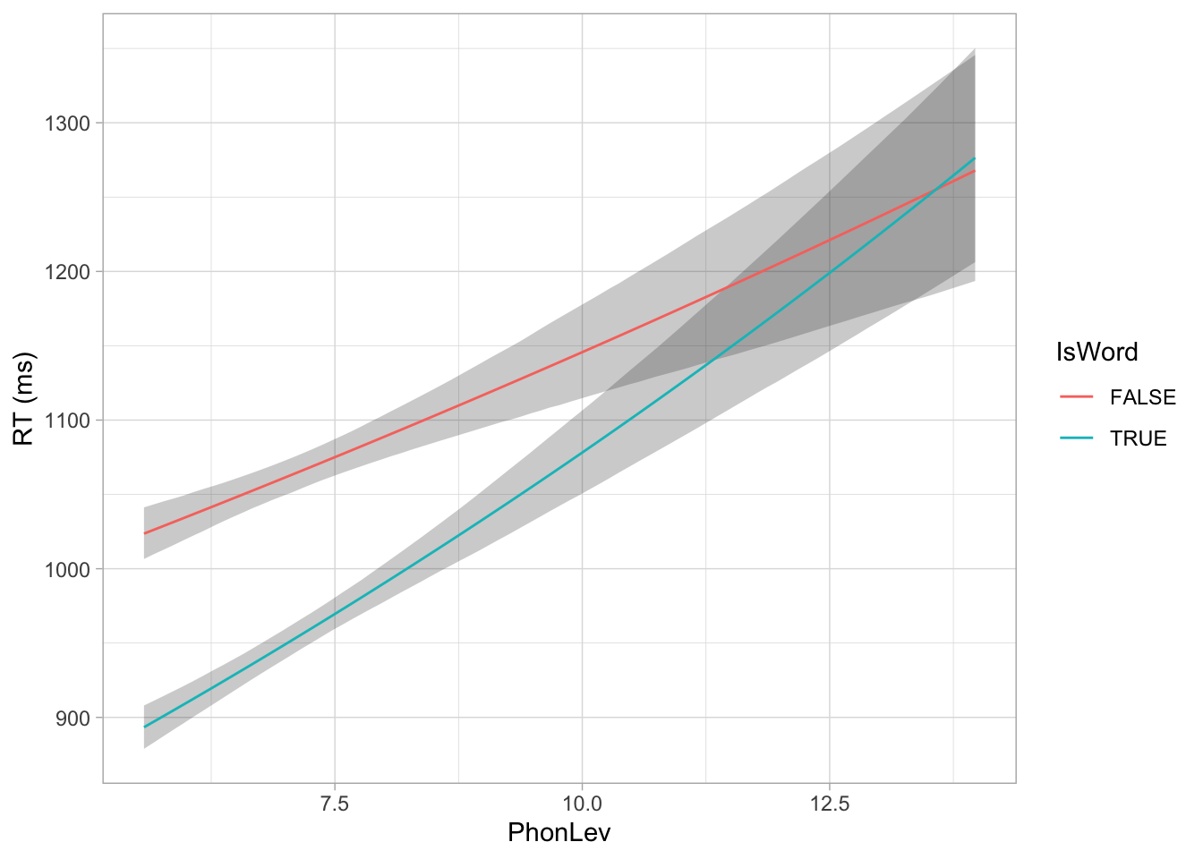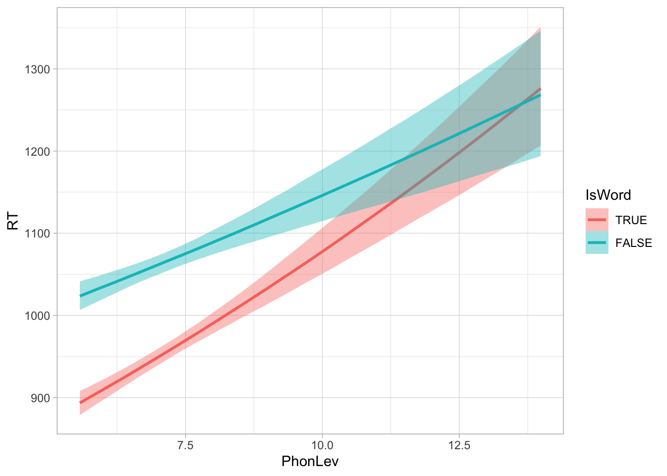 geom_ribbon(aes(ymin = lo, ymax = hi, group = IsWord), alpha = 0.25) +