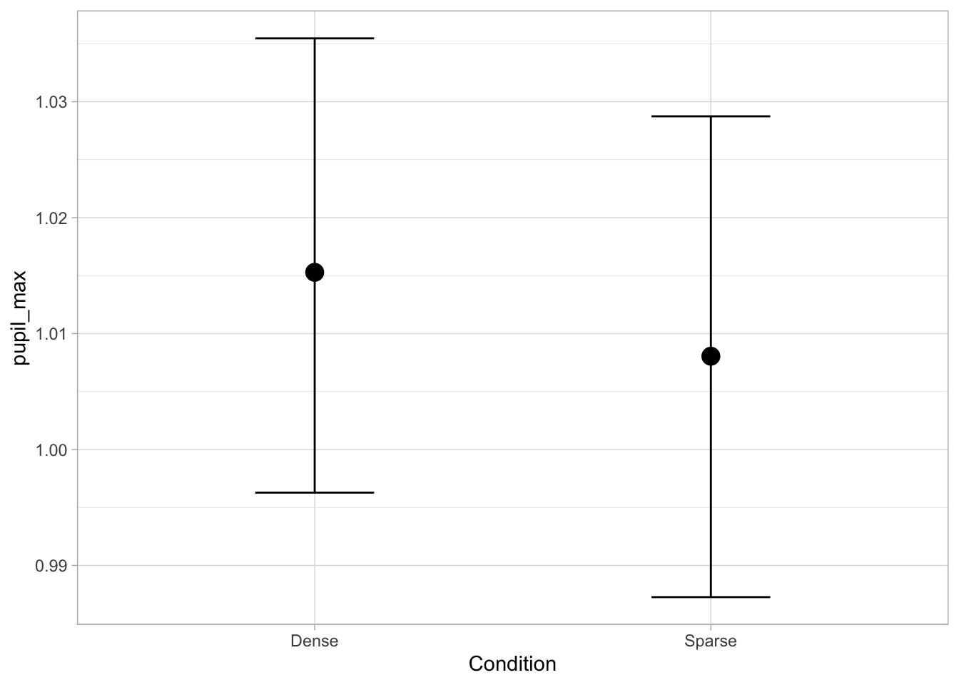 The most basic approach is to extract the MCMC draws from the model and compute the expected values from them. The following model uses data from McLaughlin et al. (2022), a study of how pupil width covaries with lexical neighbourhood density. Let’s read the data.