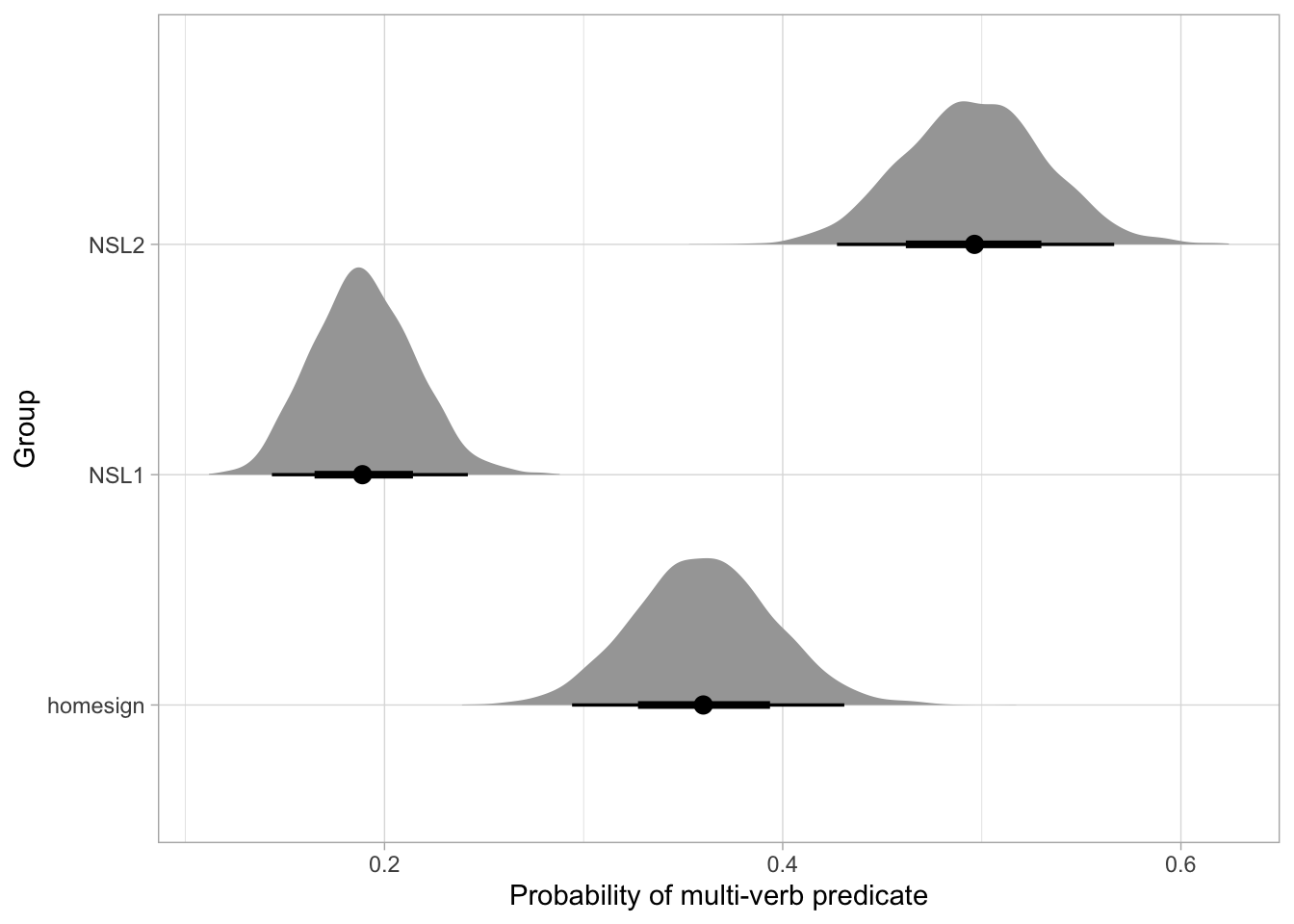 The predicted probability of multi-verb predicates in home-signers is 32-41%, for NSL1 it is 16-22% and for NSL2 it is 45-54%, at 80% confidence. Based on these results, we can see more clearly that the hypothesis of the study is not fully borne out by the data: we do not observe an increase in probability of multi-verb predicates from home-signers to NSL1 to NSL2. Instead, there is a decrease from home-signers to NSL1 and an increase from NSL1 to NSL2. Moreover, the predicted probability of multi-verb predicates in NSL2, 45-54%, indicates that NSL2 possibly use either single and multi-verb predicates with equal probability. Figure 30.7 plots the predicted posterior probabilities of multi-verb predicates.
