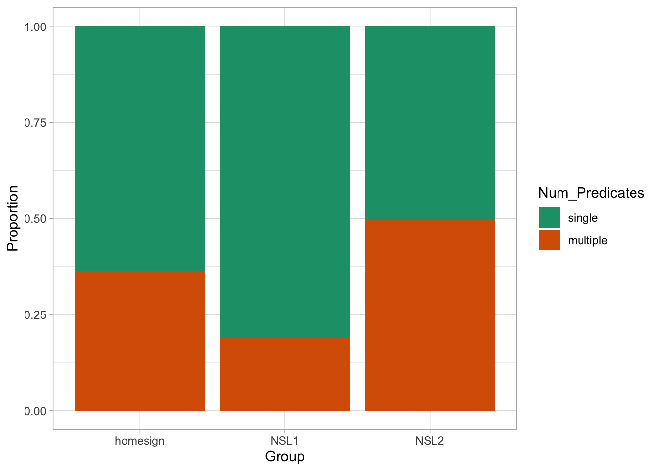 According to the model, there is a 32-41% probability of multi-verb predicates in home-signers, for NSL1 it is 16-22% and for NSL2 it is 45-54%, at 80% confidence. The results indicate that the hypothesis that the probability of multi-verb predicates should increase from home-signers to NSL1 to NSL2 is not borne out. The probability decreases by 11-22 percentage points from home-signers to NSL1, and increases by 25-36 points from NSL1 to NSL2. Moreover, the probability of multi-verb predicates in NSL2 indicates that single and multi-verb predicates are equally probable in NSL2.