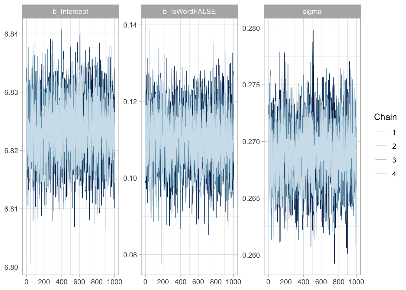 Let’s focus on Rhat: this is a measure of convergence, called \(\hat{R}\) (read “R hat”). When the MCMC algorithm shows good convergence at the end of all chains, \(\hat{R}\) is 1 or as close to 1 as possible. In this model, all \(\hat{R}\) values are exactly 1, indicating model convergence. Note that \(\hat{R}\) doesn’t have to be precisely 1, other slightly higher values of 1 are still acceptable. brms warns you if any \(\hat{R}\) value is too high, so if you don’t see warning messages when the model has finished fitting, you should not worry about it.