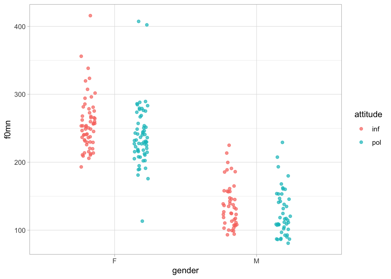 Formula: f0mn ~ gender + attitude + gender:attitude