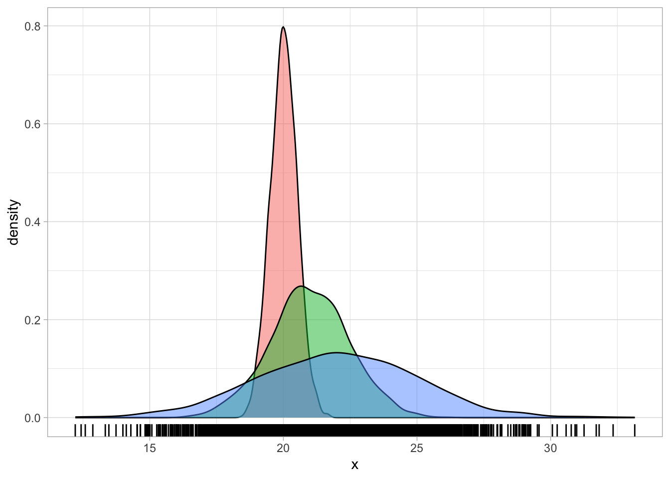 There are cases where the density plot is a combination of multiple underlying distributions with different means and SDs that makes it look as if it is skewed. For example, the following code creates a mixture of three Gaussian distributions of the same variable, but coming from three different groups, each with a slightly higher mean and SD than the first group. Figure 31.3 shows a single density curve for the data (Figure 31.3 (a)), and the density plots for the individual groups (Figure 31.3 (b)). In the single density plot, we might be given the impression that this is a log-normal variable because of the right skew, but in fact, when plotting the density curves of the individual groups we can see that the distribution in each group is quite symmetric (not skewed) and quite Gaussian-like.