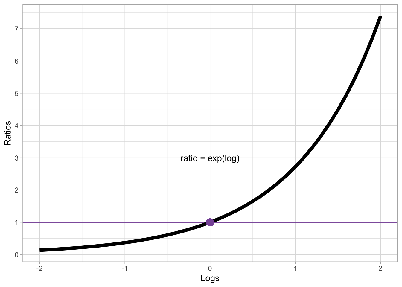 annotate("text", x = 0, y = 3, label = "ratio = exp(log)") +