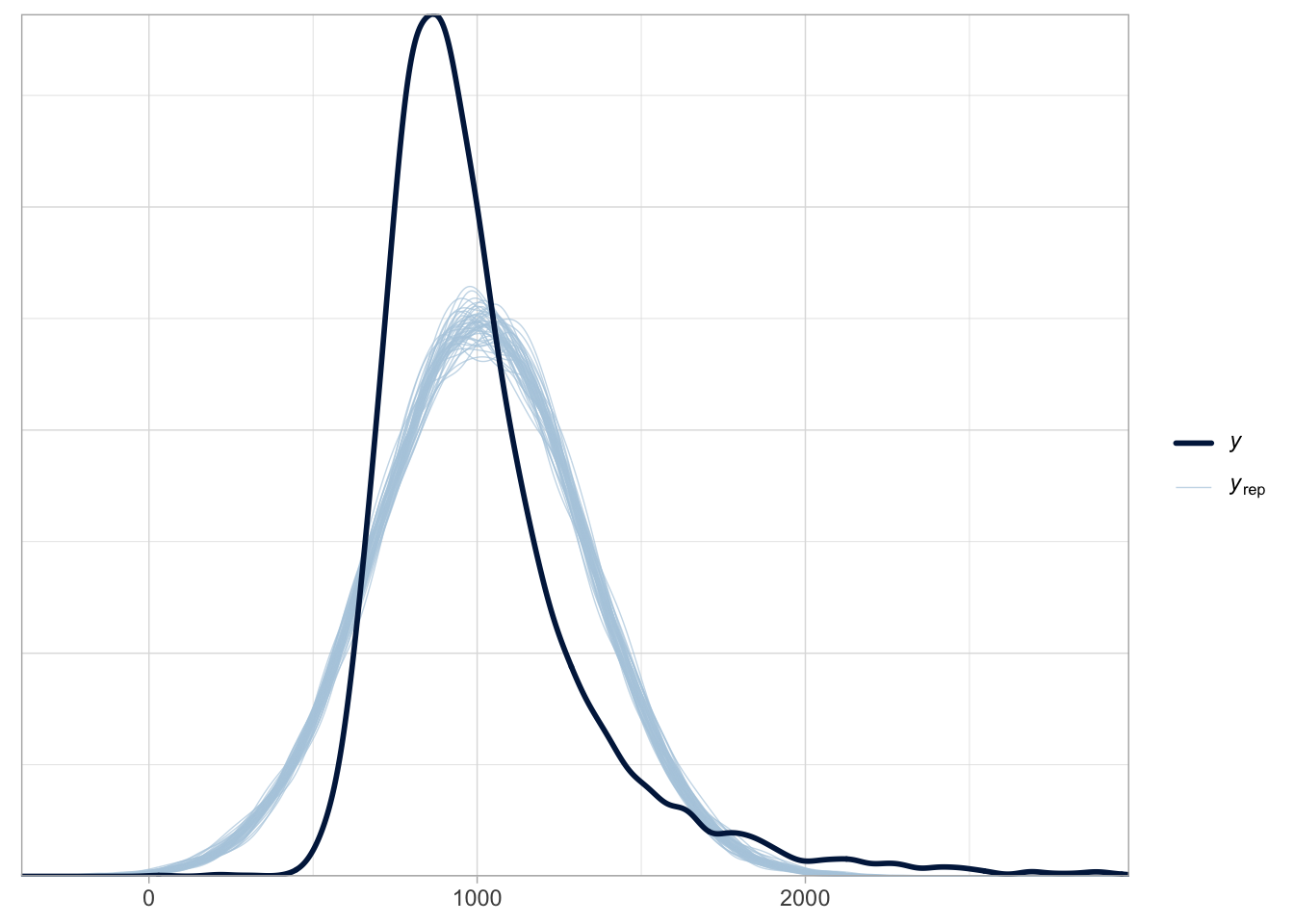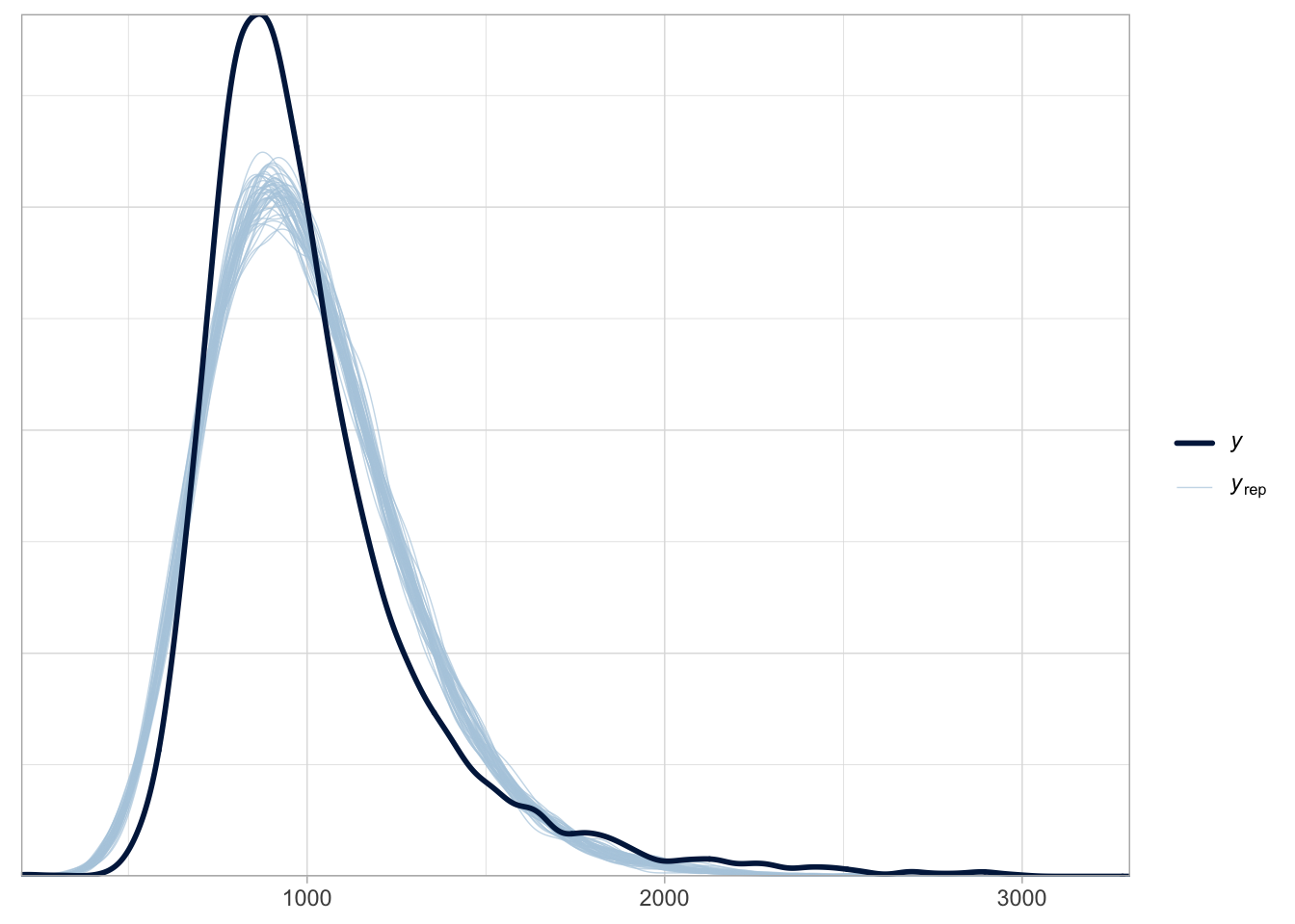 to use 50 random draws from the MCMC draws to reconstruct joint posteriors. These are in light blue in the figure. The dark blue, thicker line is the empirical density of the data, the same density you would get with geom_density()