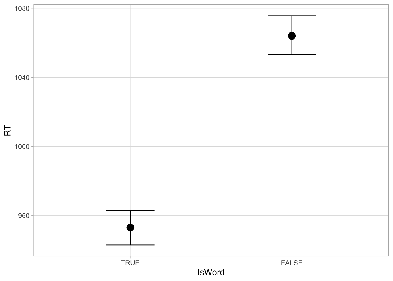 function. Figure 31.7 shows the output of the function. Note how RTs are plotted on the original millisecond scale, rather than in logged milliseconds.