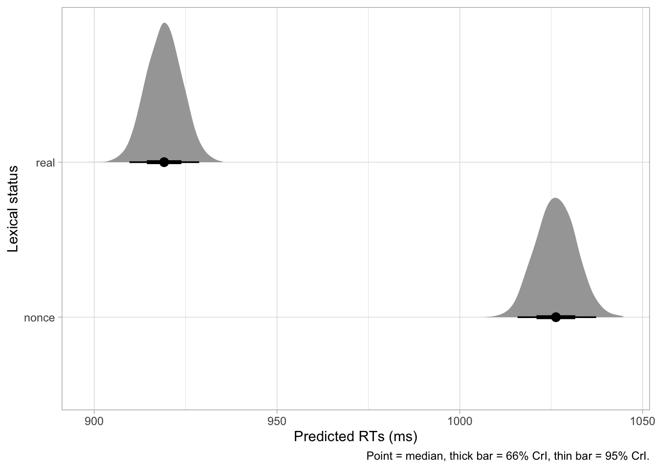 The model indicates that the average RT for real words is between 908-925 ms at 80% confidence (\(\beta\) = 6.82, SD = 0.01). RTs for nonce words are between 90-117 ms longer than for real words (\(\beta\) = 0.11, SD = 0.01), at 80% probability. Average RTs for nonce words are predicted to be between 1014-1033 ms, at 80% confidence.