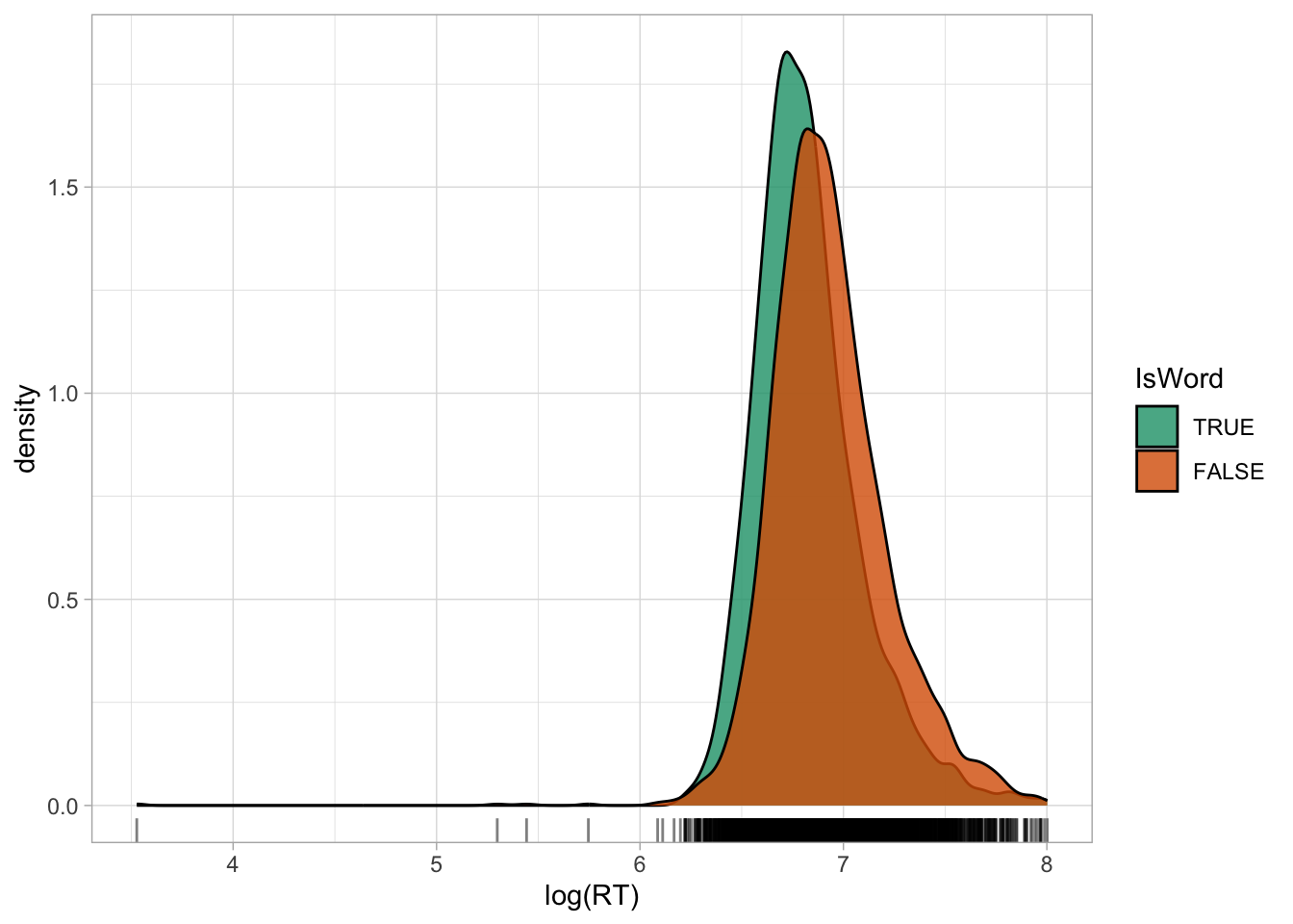 Figure 31.2 shows the densities of logged RTs for real and nonce words. Note how the density curves are less skewed now compared to Figure 31.1. You will also note that the some lower RTs values now look more extreme than in the first figure: logging a variable compresses the scale more at higher values and spreads the scale more at lower values, which results in the reduction of right-skew, but also in making very low values look more extreme. Before moving onto discussing what to do with outliers, an important clarification is due.