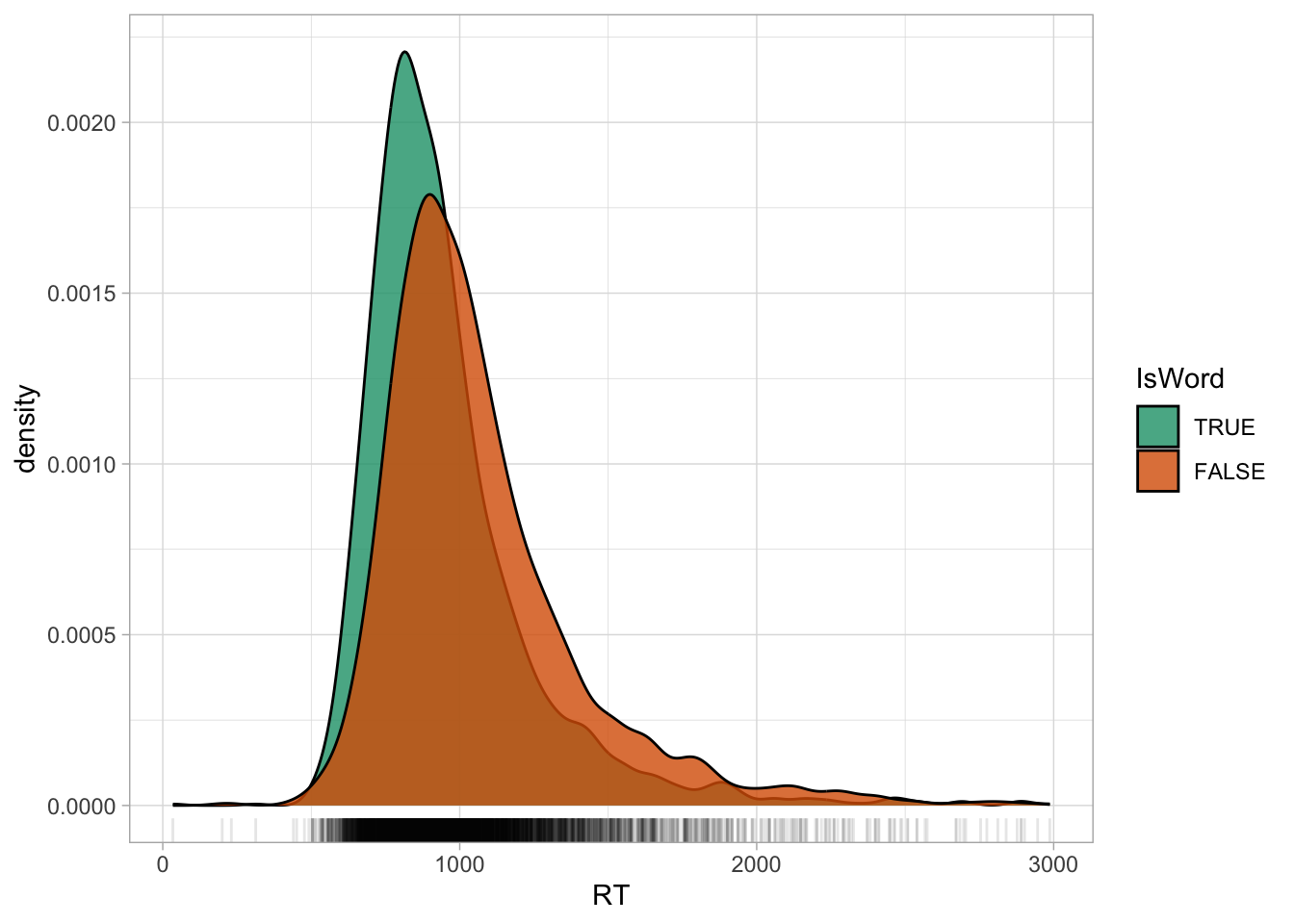I will illustrate the nature of log-normal variables using reaction times (RT) from Tucker et al. (2019). Let’s read the data and plot RTs depending on the word type. Recall we ran a Gaussian regression model of the data in Chapter 27.