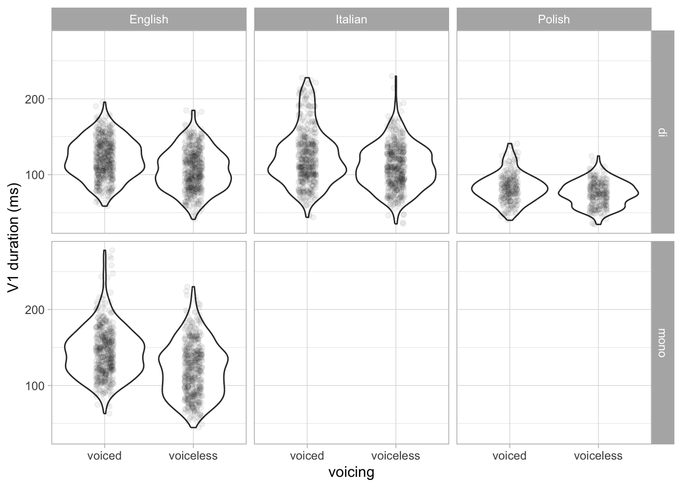 Here is a breakdown of number of observations per voicing \(\times\) number of syllables (only English has mono- and disyllabic data):